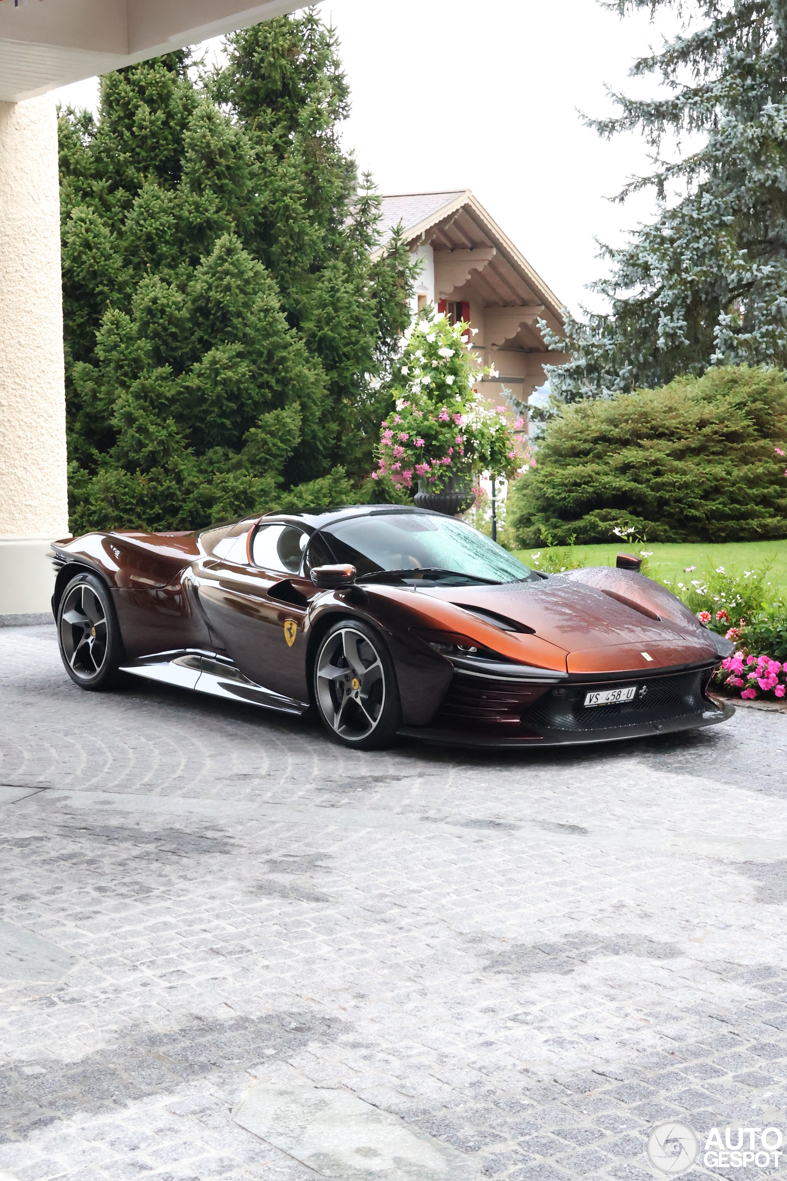 This Sp3 is in my oppinion the most beautiful in the world. Finished in the gorgeous Rosso Taormina, it looks even better under the rain. This car was not part of the Palace Challenge ! The owner just spent the weekend in Gstaad. The car has been recently imported from UAE, that's why it wear a garage plate.